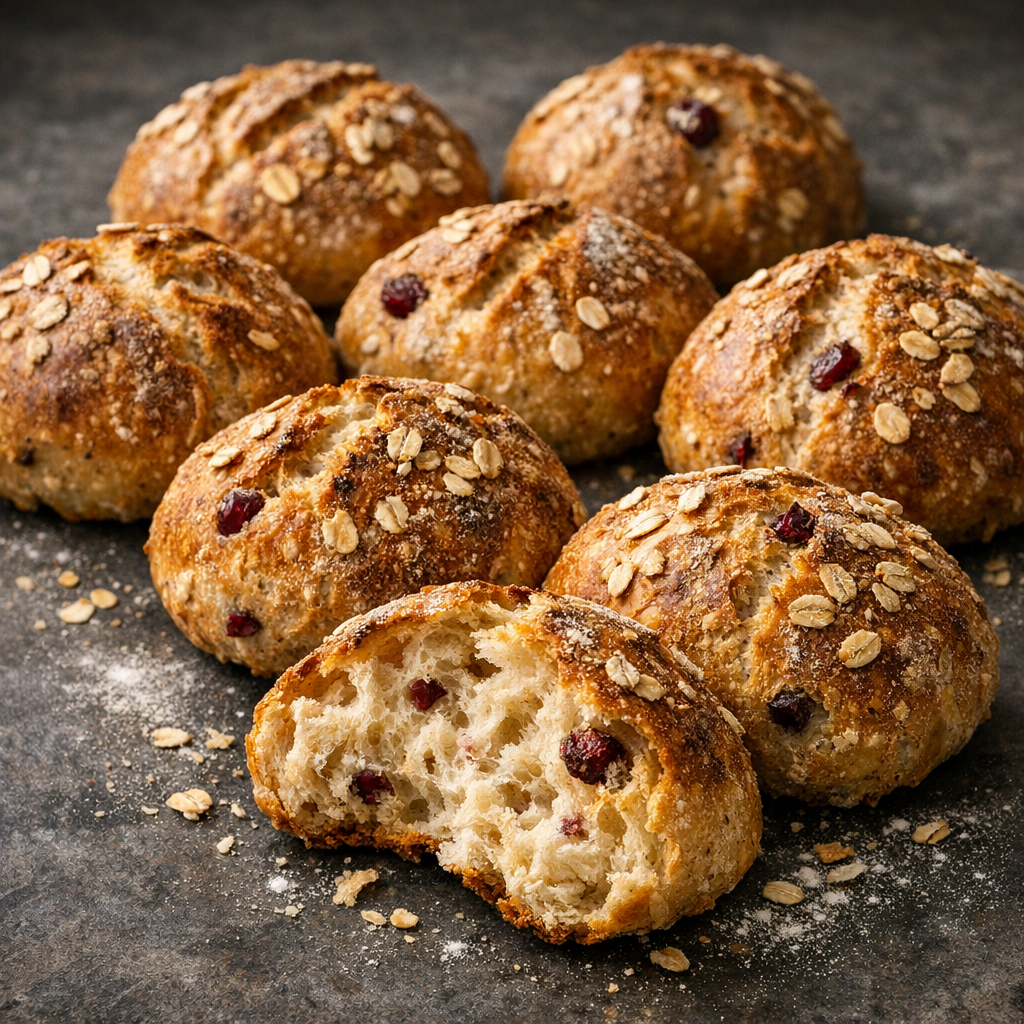 Krachend knusprige Familien-Semmeln mit zarter Krume, feiner Buttermilch-Milde, saftigen Cranberries und einem Hauch Hafer – klar, modern, unwiderstehlich.