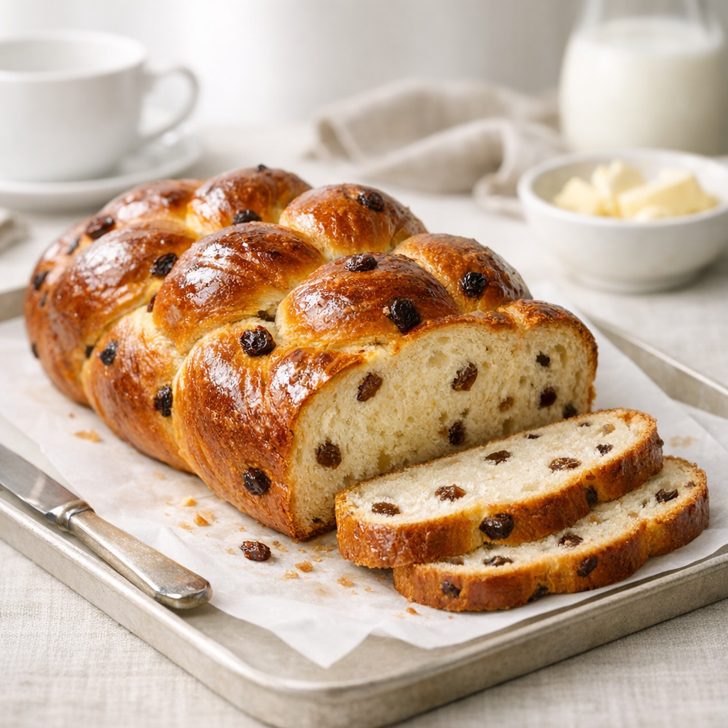 Ein schneller, milder Familien-Zopf mit softem Brioche-Charakter, lockerem Biss und saftigen Rosinen – elegant, bekömmlich, unter 3 Stunden.
